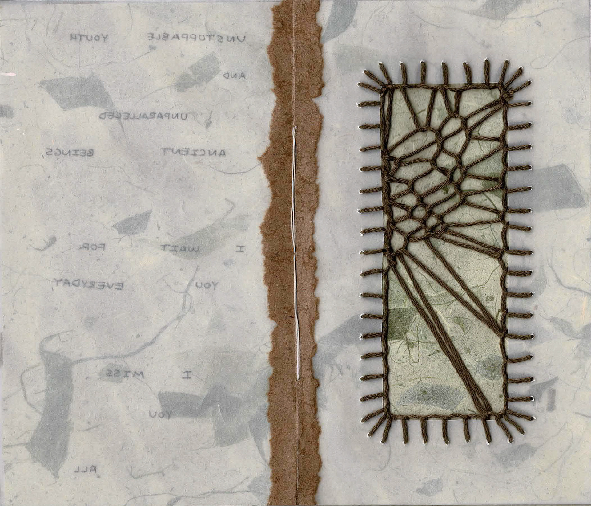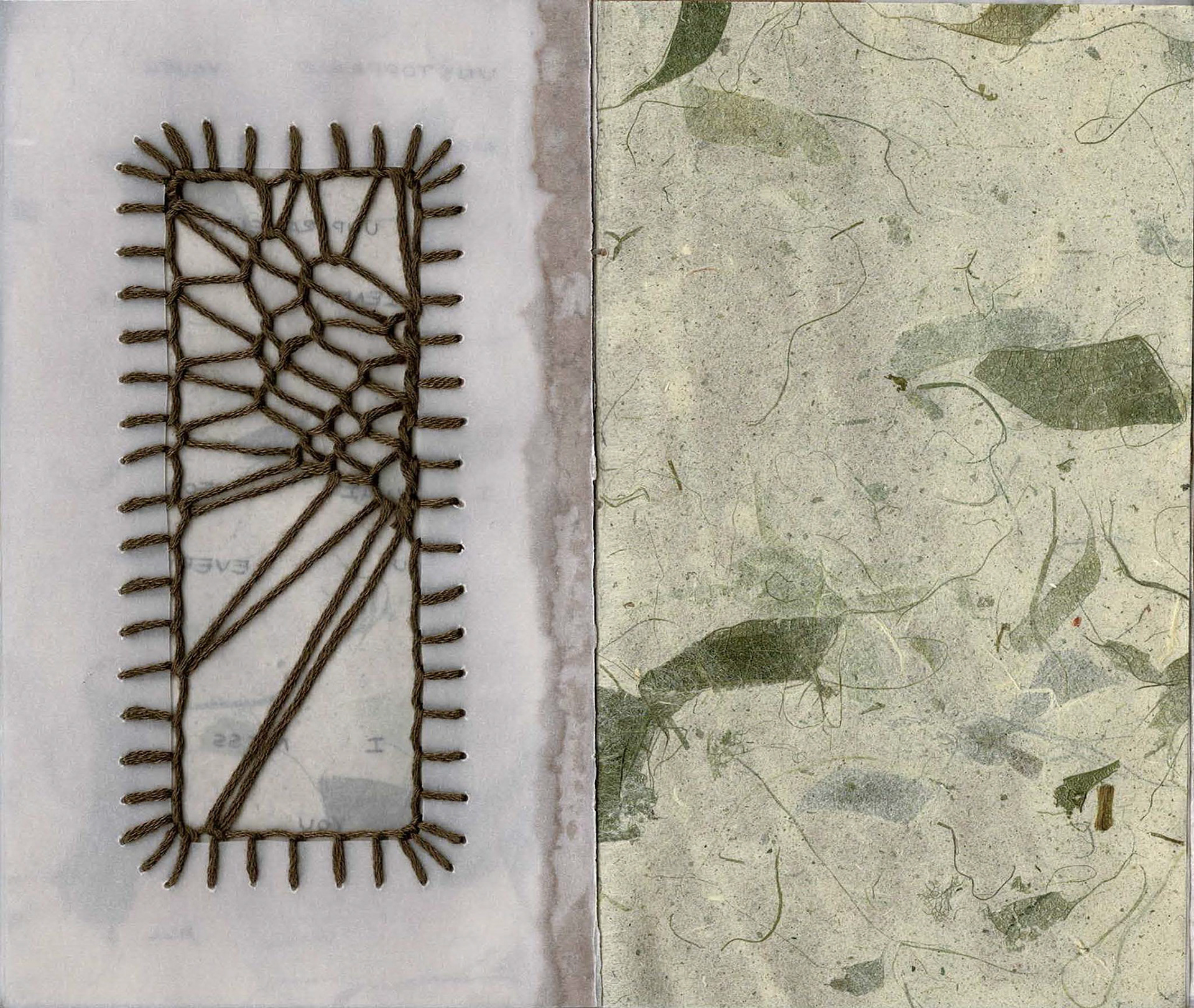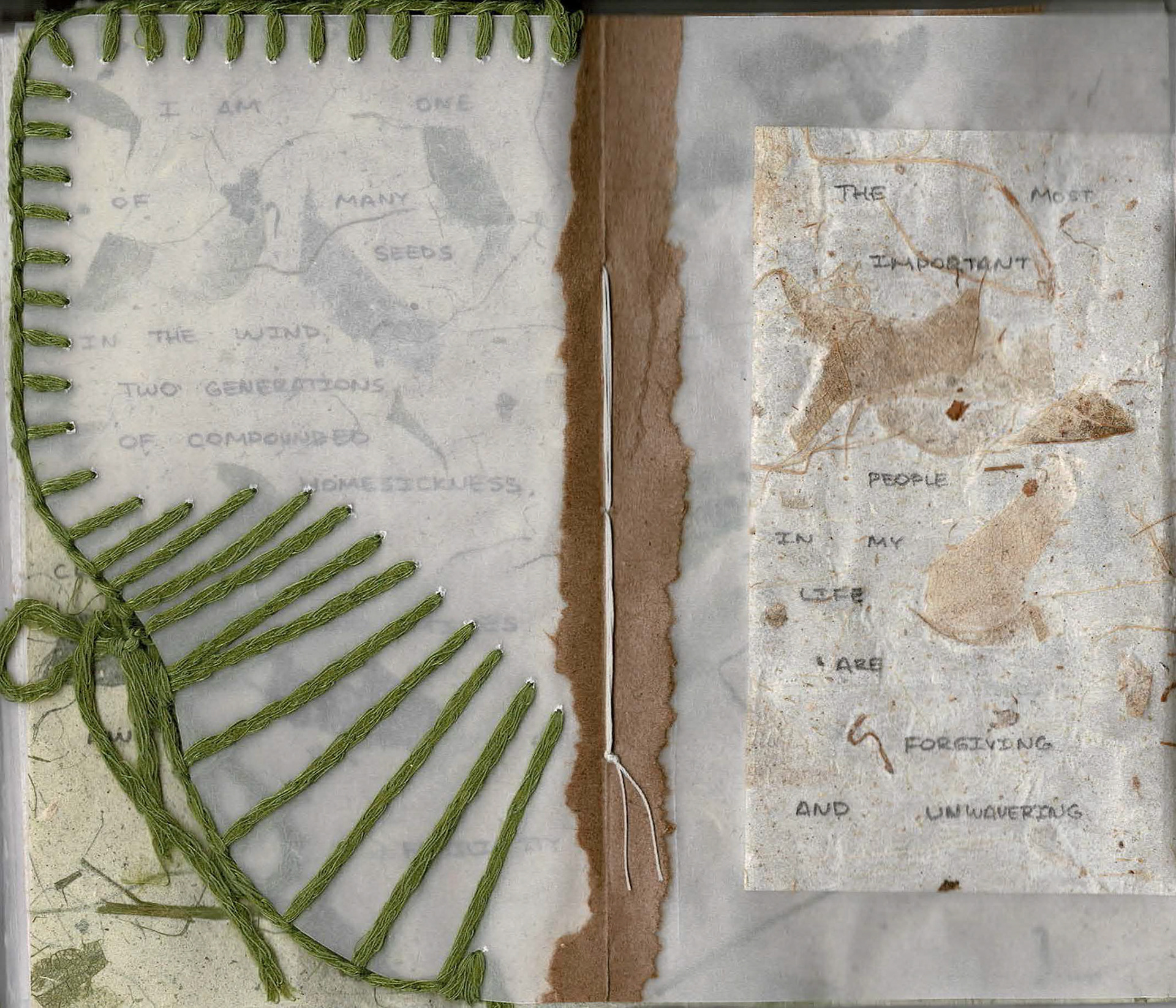 Selections from my Bible, respire&retire This art book compares the overwhelming rush of emotions felt when spending extended periods of time in nature with that felt when thinking of my family. I adopt a ritual grounding practice and maintain daily conversation with my new neighbor in Providence, RI, an American Elm tree, in whom I find my parents, my ancestors, my future, and a home for many androgynous bodies. I follow my stream of consciousness and begin to decentralize myself. I find intelligence in the systems that cradle me, I feel humility as we exchange oxygen. Investigating cellular structures and groups of 3, bark textures, branching patterns, quietude. Vellum, collage, paper cutting, embroidery, graphite in 3.5 x 6” coptic-bound handbook