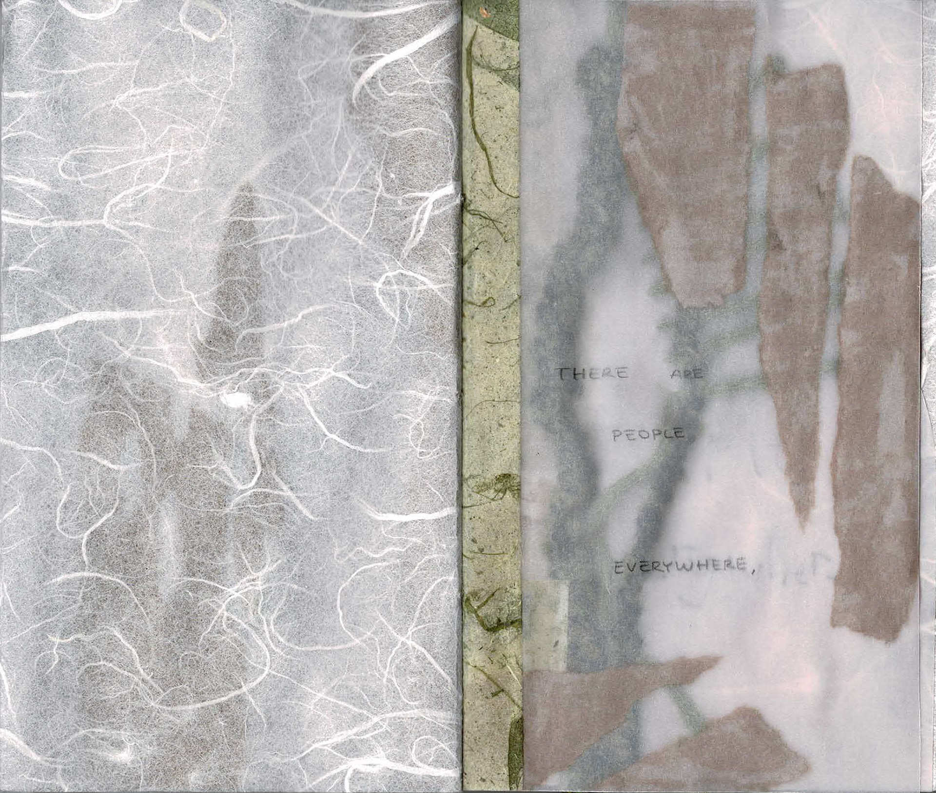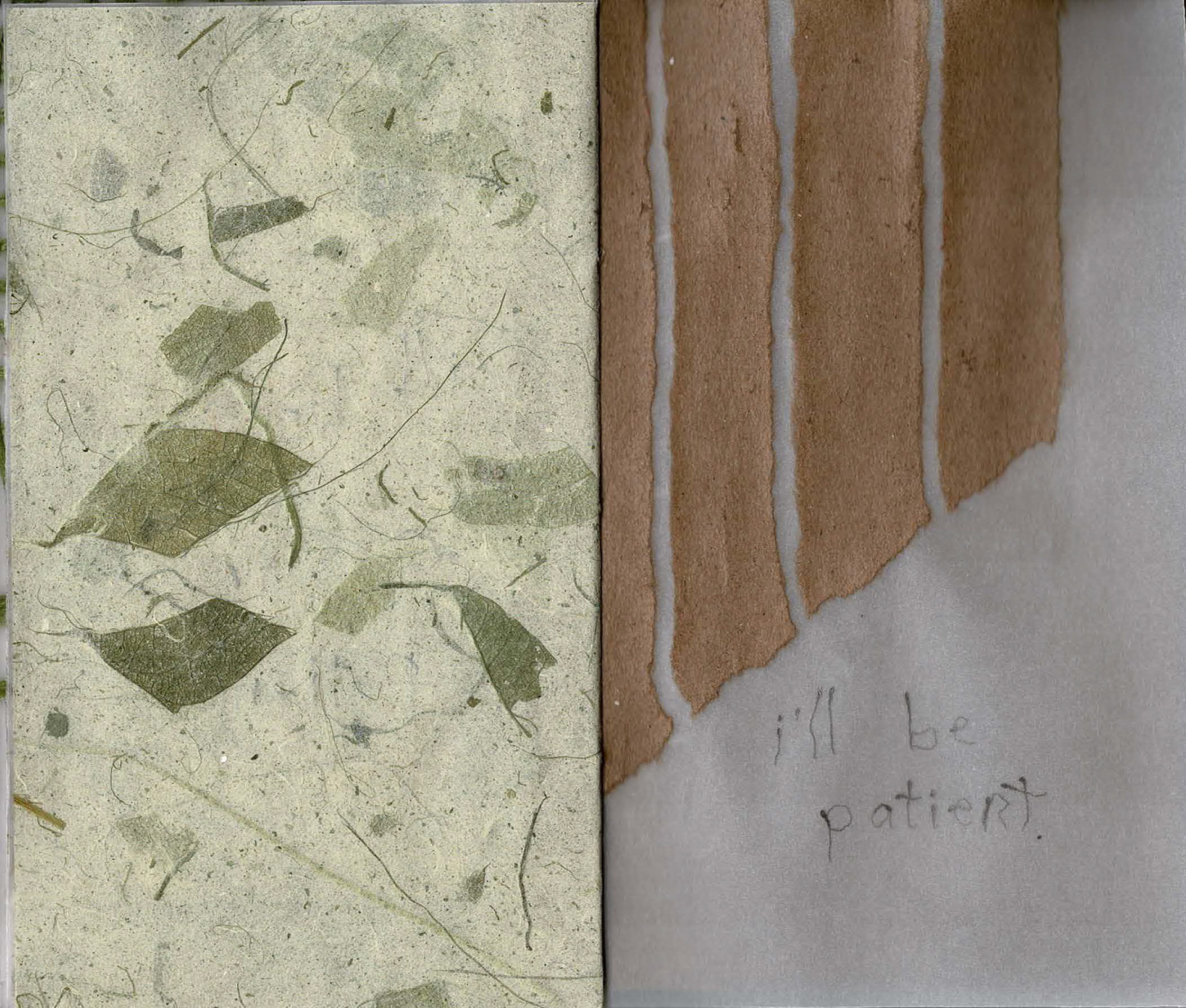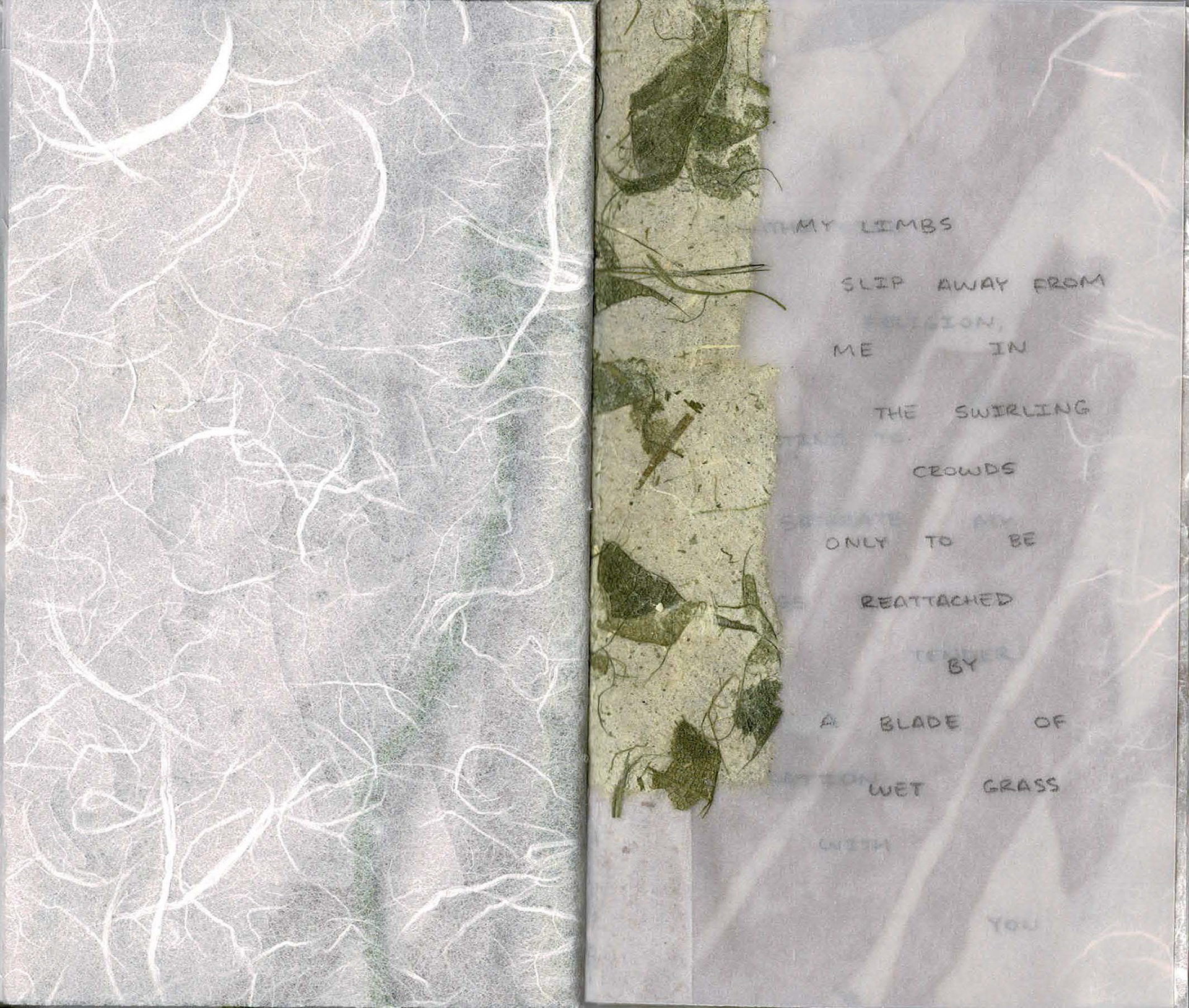Selections from my Bible, respire&retire This art book compares the overwhelming rush of emotions felt when spending extended periods of time in nature with that felt when thinking of my family. I adopt a ritual grounding practice and maintain daily conversation with my new neighbor in Providence, RI, an American Elm tree, in whom I find my parents, my ancestors, my future, and a home for many androgynous bodies. I follow my stream of consciousness and begin to decentralize myself. I find intelligence in the systems that cradle me, I feel humility as we exchange oxygen. Investigating cellular structures and groups of 3, bark textures, branching patterns, quietude. Vellum, collage, paper cutting, embroidery, graphite in 3.5 x 6” coptic-bound handbook